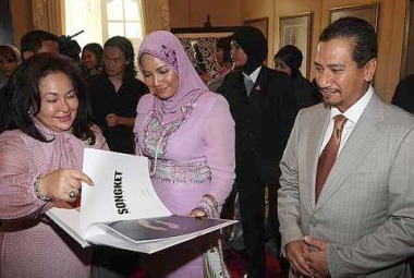 Royal presence: Tuanku Mizan (right) looking on as Tuanku Nur Zahirah (right) and Rosmah flip through the book titled ‘Songket Revolution’.